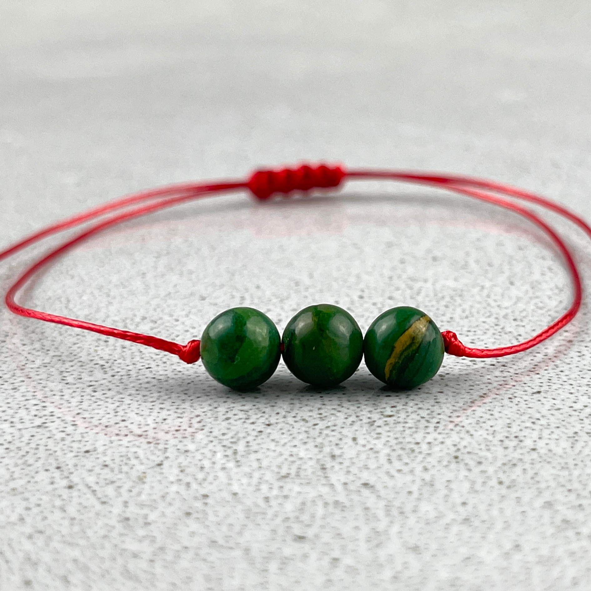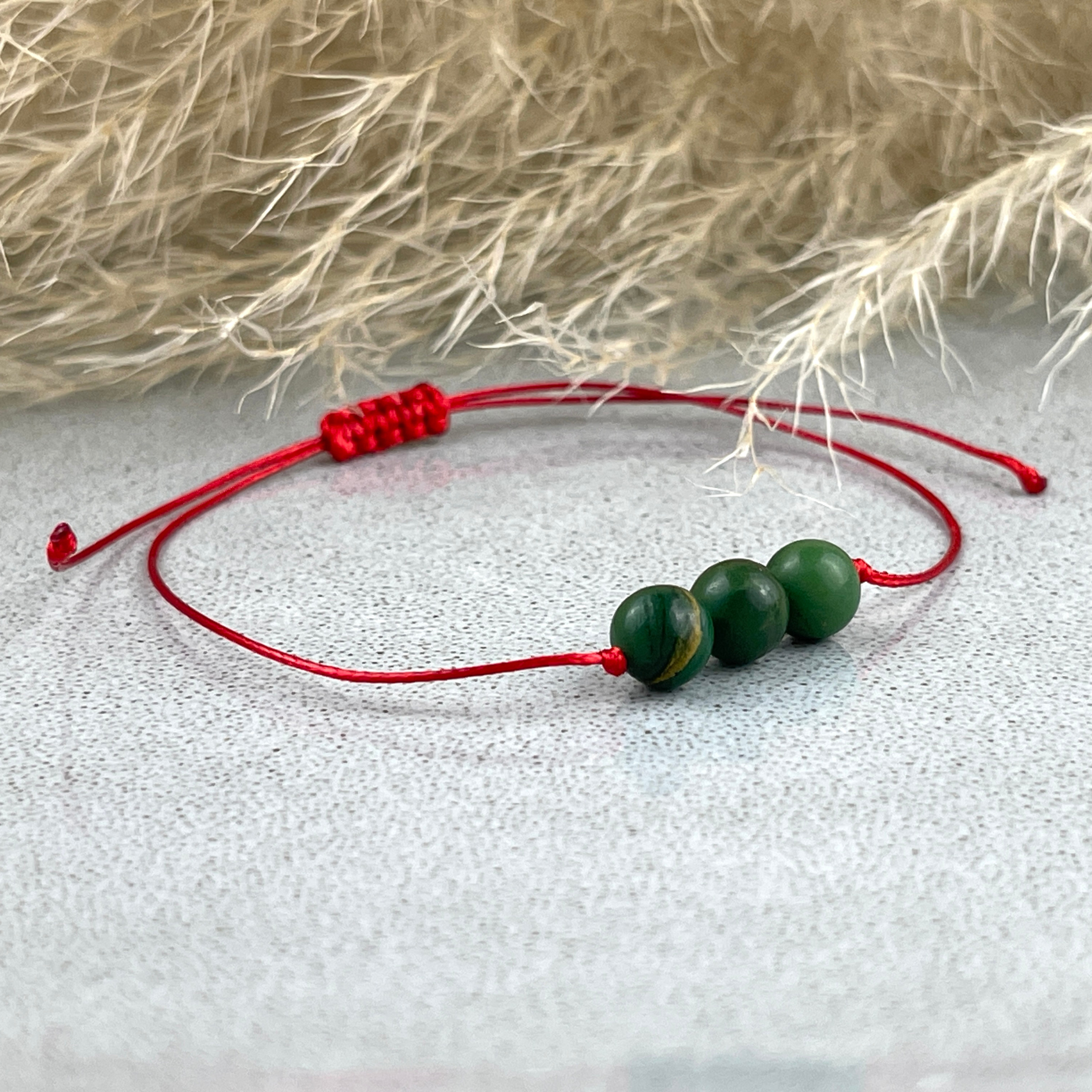 ✨ Bransoletka Szczęścia z Trzema Jadeitami na Czerwonej Nitce ✨
