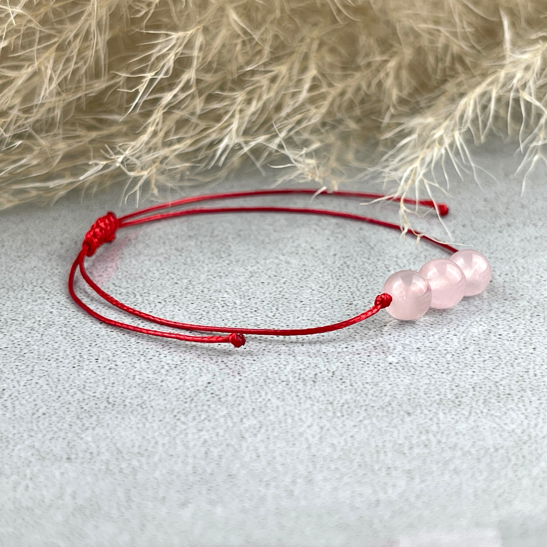 ✨ Bransoletka Szczęścia z Trzema Różowymi Kwarcami na Czerwonej Nitce ✨